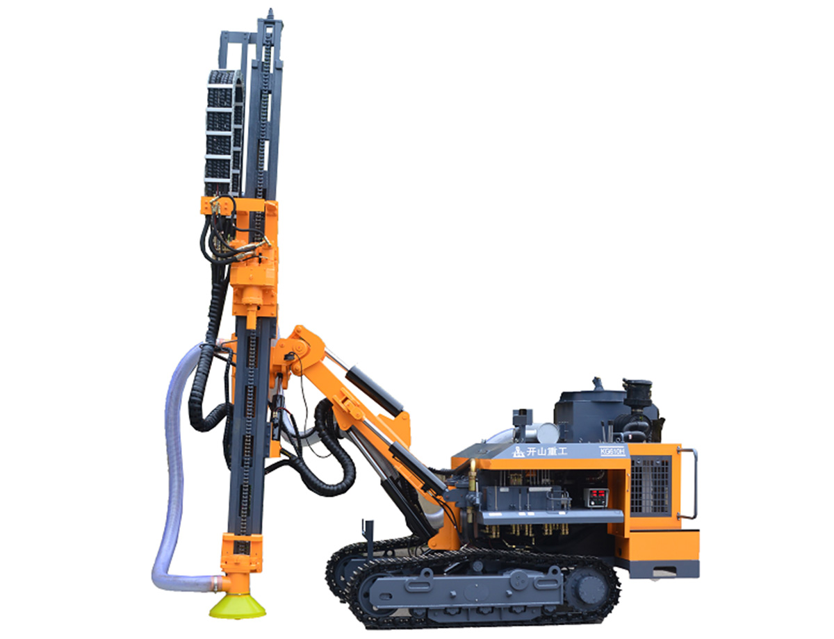 KG610/KG610H型露天潛孔鉆車是應國家對環(huán)保要求而進行升級的一款新設(shè)備。配備玉柴四缸國三發(fā)動機,滿足國家對排放和環(huán)保的要求。采用柱塞行走馬達,折邊履帶架和工程四輪一帶,提高工作壓力,增加爬坡性能。增大俯仰和舉臂油缸,滿足極限位置使用要求。同時對液壓系統(tǒng)升級,增大系統(tǒng)流量,提高回轉(zhuǎn)轉(zhuǎn)速?;剞D(zhuǎn)器采用雙馬達減速器,增大回轉(zhuǎn)扭矩和轉(zhuǎn)速。對加大提升油缸和鏈條,提高提升力和可靠性。加固導軌和增加滑板上下耐磨板,延長使用壽命。導軌采用傾斜安裝,方便操作和觀察。罩殼采用加厚型材折邊,增加強度和剛性,增加起吊吊環(huán),方便裝卸吊裝。