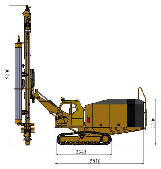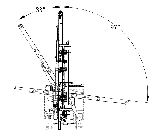 3. 滑架擺角采用經(jīng)過(guò)優(yōu)化的變幅機(jī)構(gòu),總擺角達(dá)130°(右97°,左33°),無(wú)需更換支點(diǎn)可自由完成豎直孔與水平孔的轉(zhuǎn)換;最低水平孔高度550㎜,最高可達(dá)4500;