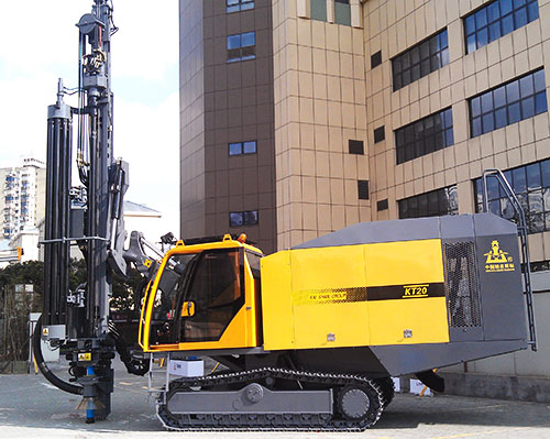 "開山"牌KT20型露天潛孔鉆車是開山集團(tuán)在多年開發(fā)生產(chǎn)潛孔鉆車的基礎(chǔ)上,針對(duì)大型露天礦山的需求,而精心設(shè)計(jì)的新型鑿巖設(shè)備。該鉆車行走、推進(jìn)、回轉(zhuǎn)及角度調(diào)整等動(dòng)作均采用液壓驅(qū)動(dòng),動(dòng)力強(qiáng)勁;配用高風(fēng)壓螺桿機(jī)頭及高風(fēng)壓氣動(dòng)沖擊器,鑿巖效率高;配有液壓干式集塵器收集粉塵,減少對(duì)環(huán)境的污染;并配有液壓機(jī)械手及鉆桿庫(kù)拆缷鉆桿、浮動(dòng)接頭保護(hù)鉆桿螺紋,一個(gè)人即可拆缷鉆桿;空調(diào)駕駛室提供舒適的工作環(huán)境及自動(dòng)控制防卡閥減少卡鉆機(jī)率。鉆車具有整體性好、自動(dòng)化程度高、鑿巖效果好、環(huán)保節(jié)能、操作方便、機(jī)動(dòng)靈活、行駛安全等特點(diǎn)。